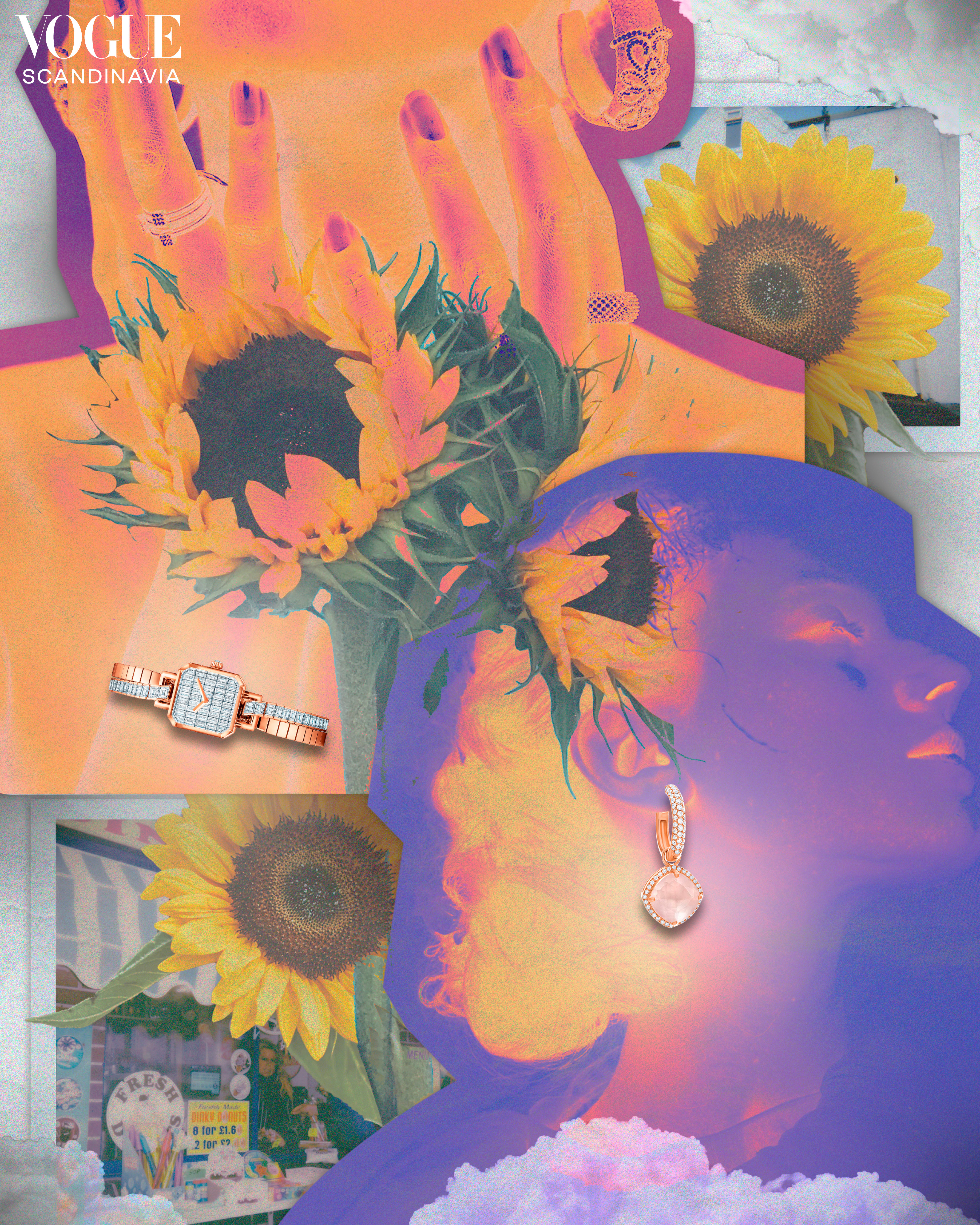 For this project, I got the creative freedom to design digital collages similar to some of my previous work. The goal was to highlight the watches of the season and pair them with earrings weaved into colourful collages. The three spreads (six collages) are featured in the seventh issue of the Vogue Scandinavia magazine.